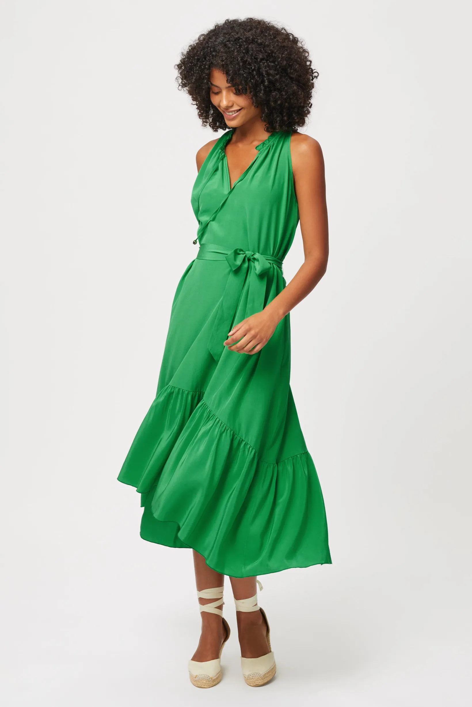 The Chamarel Silk Frill Midi Dress is made of 100% silk crepe de chine in a striking green shade. It features a V-neckline and a raised front hem which gracefully flows into a deep ruffle finish. The dress is designed with intricate details, including a pretty ruffle trim neckline and a removable belt for personal styling.