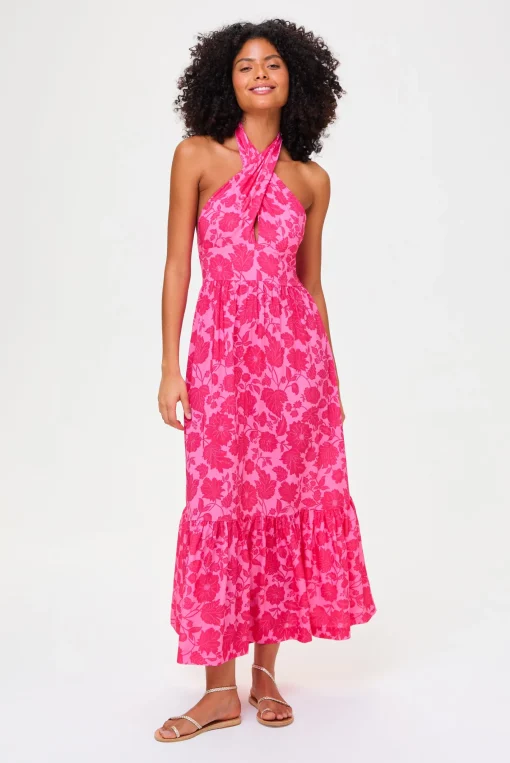 Our Fairhaven cross neck maxi dress, in a bold pink floral print, has a pretty smocked back and tie behind the neck – perfect for summer evenings.