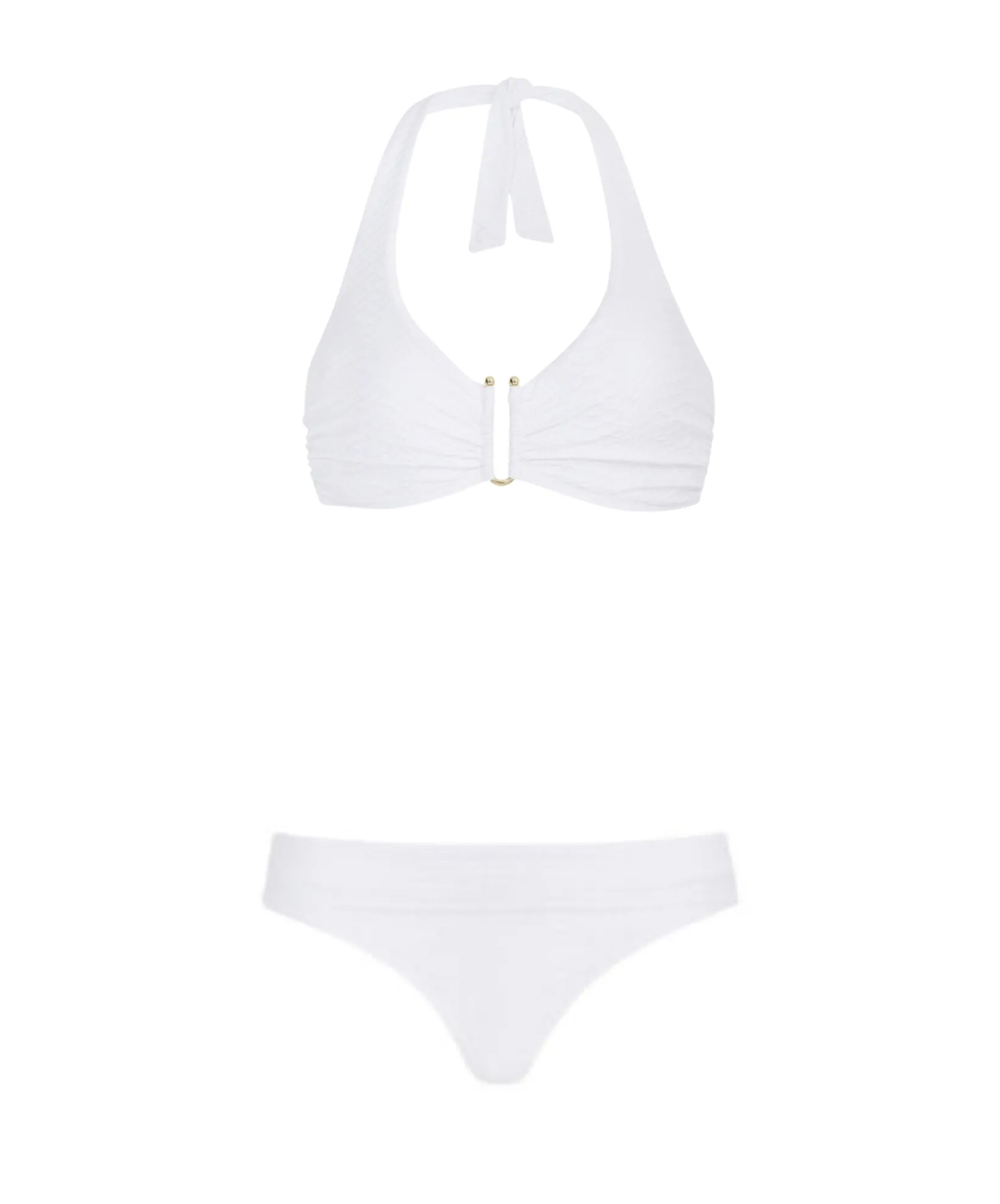 Our most supportive bikini top, the U-Bar Halterneck is specifically designed for a fuller cup size. This high-support bikini has been crafted in clean white snake jacquard fabric, featuring wide straps at the back and neck to provide comfort and adjustability. The underwiring and side boning offer enhanced support while the U-bar hardware adds a flattering detail.