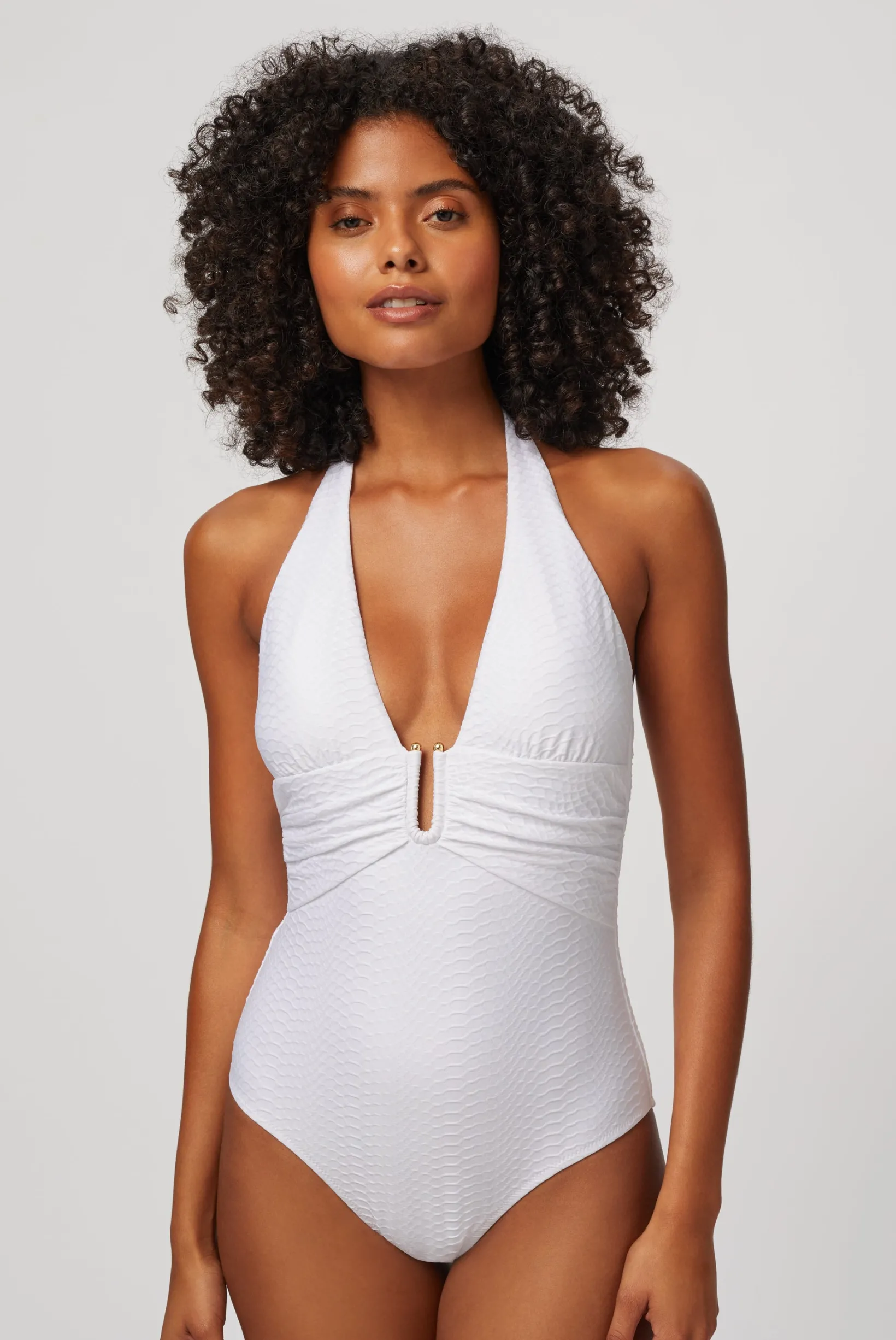 The U-Bar Halterneck Swimsuit provides the perfect combination of support and sculpting, thanks to its decorative under-bust panel and U-bar hardware. It features a clean white snake jacquard fabric, with an adjustable halterneck and removable padding for a perfect fit.