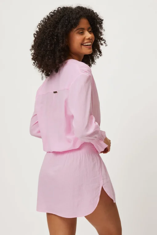 In a pretty powder pink, the Sicily Smocked Kaftan is crafted from a light and breathable 100% organic cotton cheesecloth.