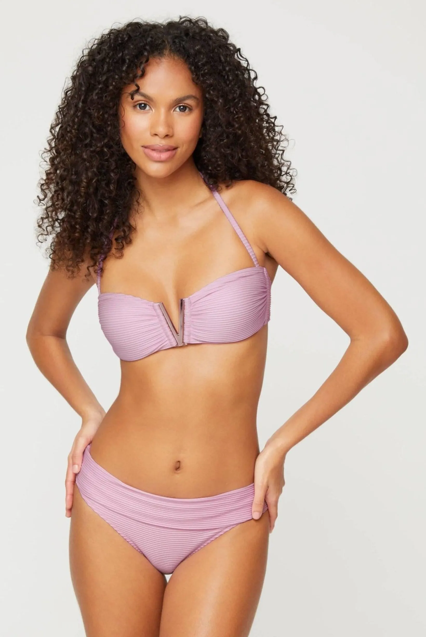 The Sicily V Bar Bikini, designed in a pretty powder pink crafted from our sustainable bespoke ribbed fabric with luxurious silver hardware.