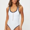Our racerback swimsuit in white and navy, is both sporty and stylish adorned with our signature chunky gold zip. This iconic swimsuit creates an effortless silhouette with the hidden shelf-bra for enhanced support.