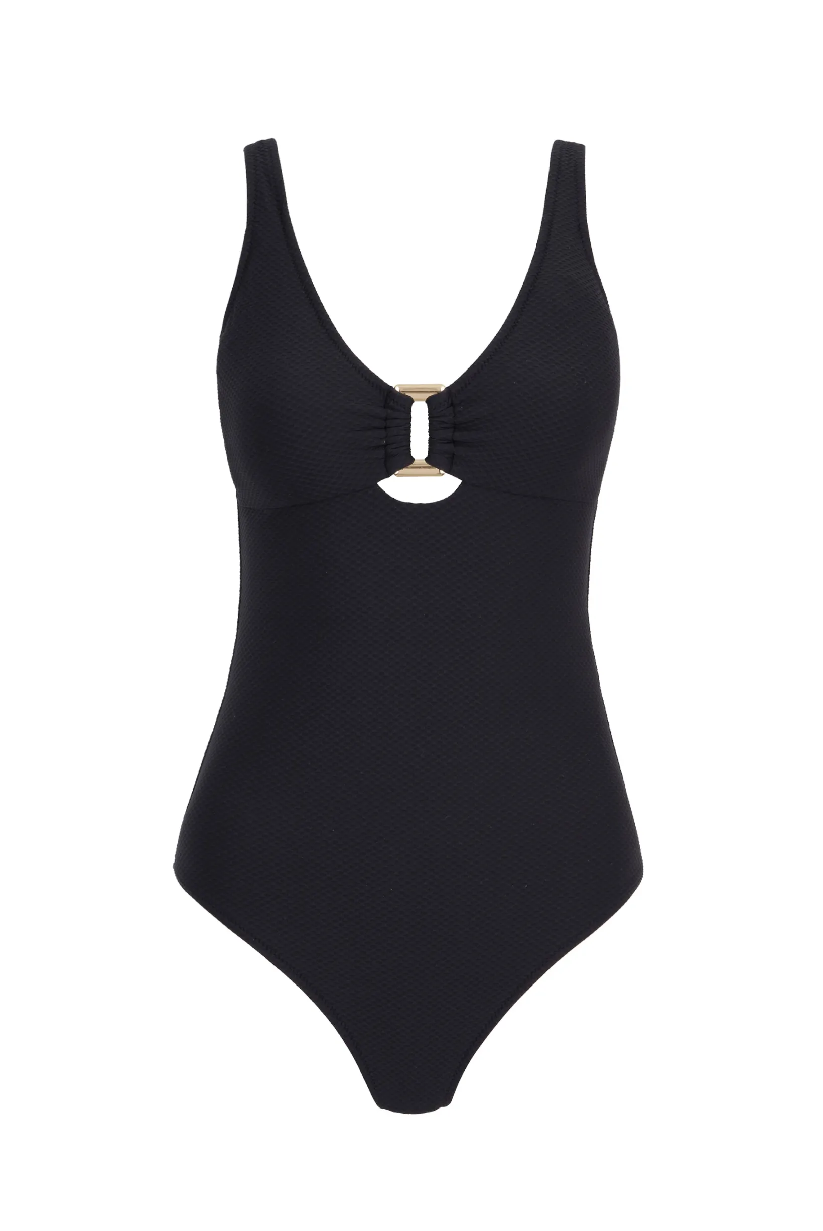 Introducing our black rectangle swimsuit, a new silhouette, crafted in our sustainable textured honeycomb fabric and finished with chunky gold hardware. This iconic swimsuit creates an effortless silhouette with the hidden shelf-bra for enhanced support.