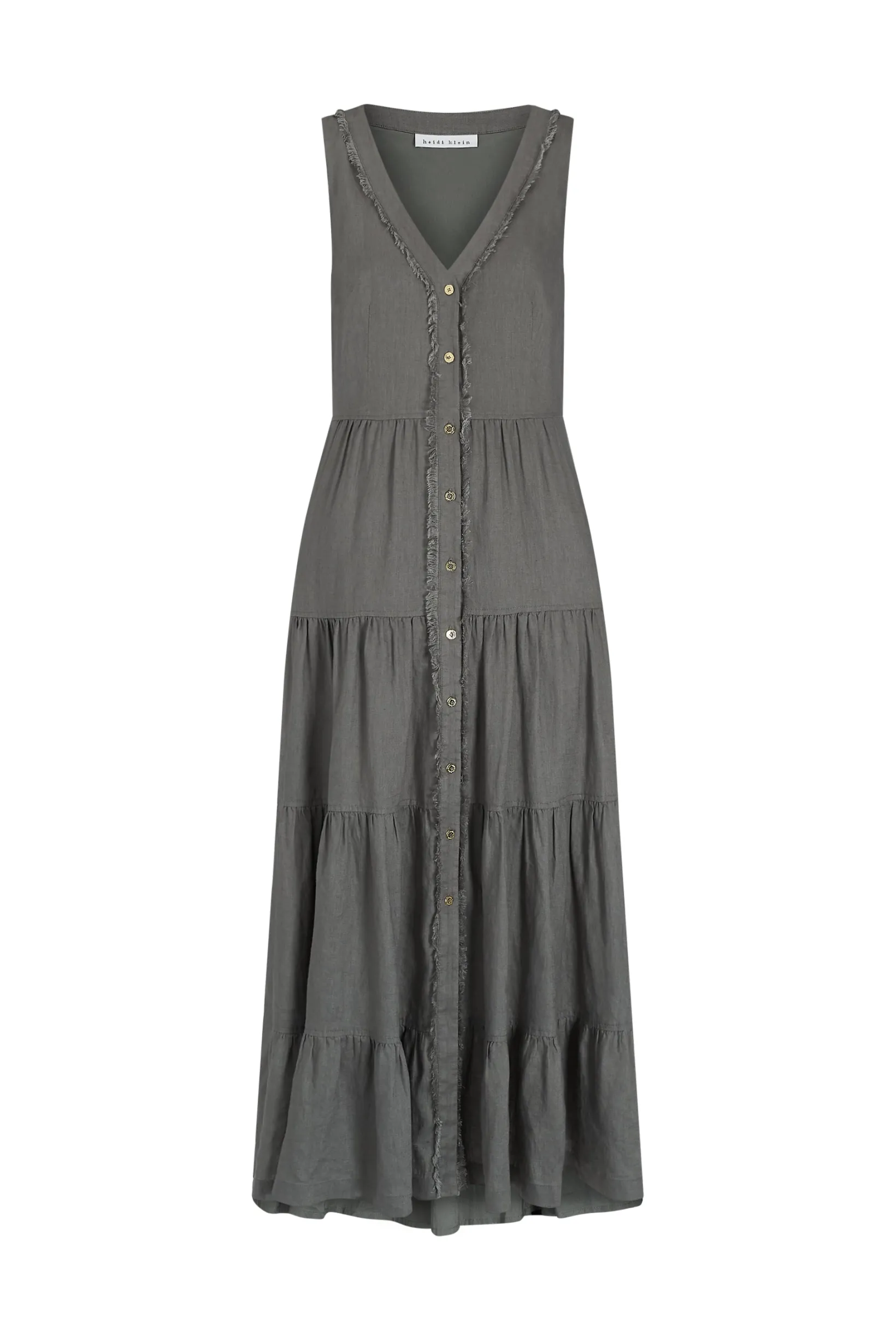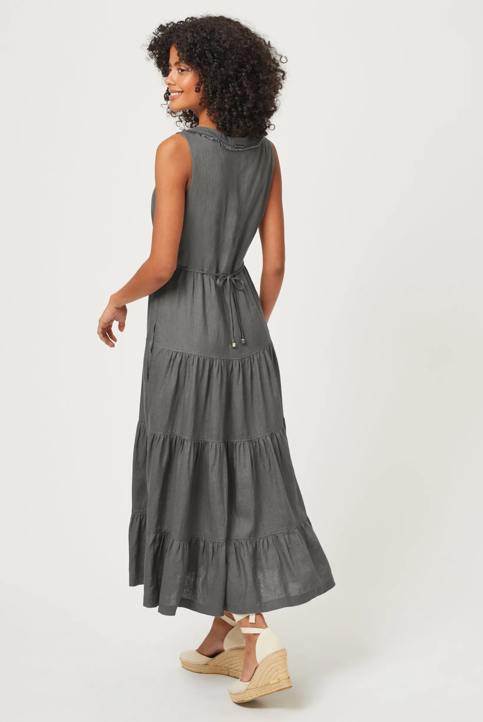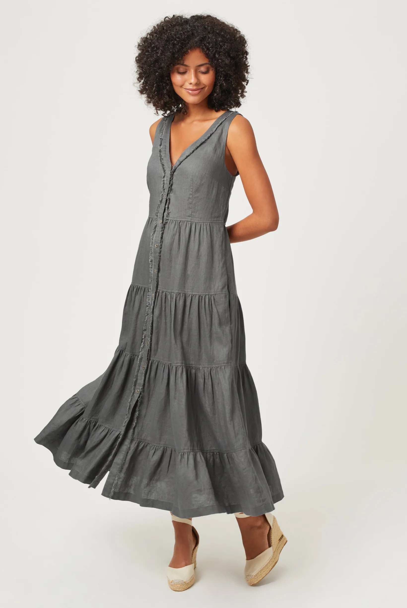 The linen Lake Maggiore Plunge Buttoned Maxi Dress has been designed with flexibility in mind. While the button-through placket and offer some tailored elements, the free-flowing, tiered skirt offers a more relaxed look for the summer. This is the perfect dress for a day in the city or an evening by the coast.