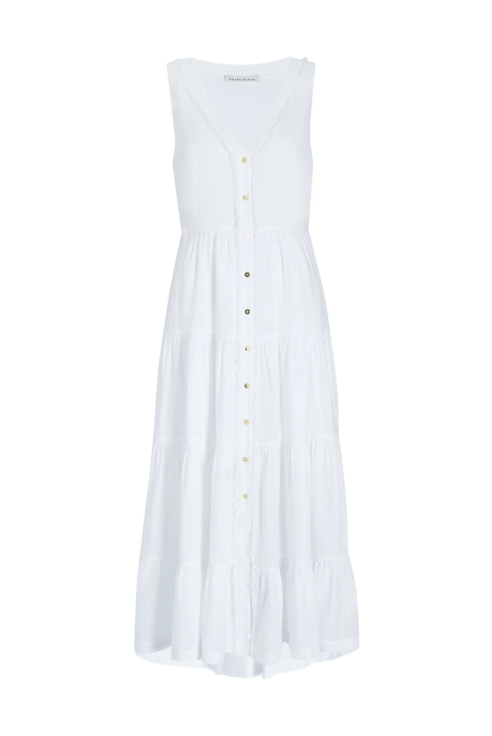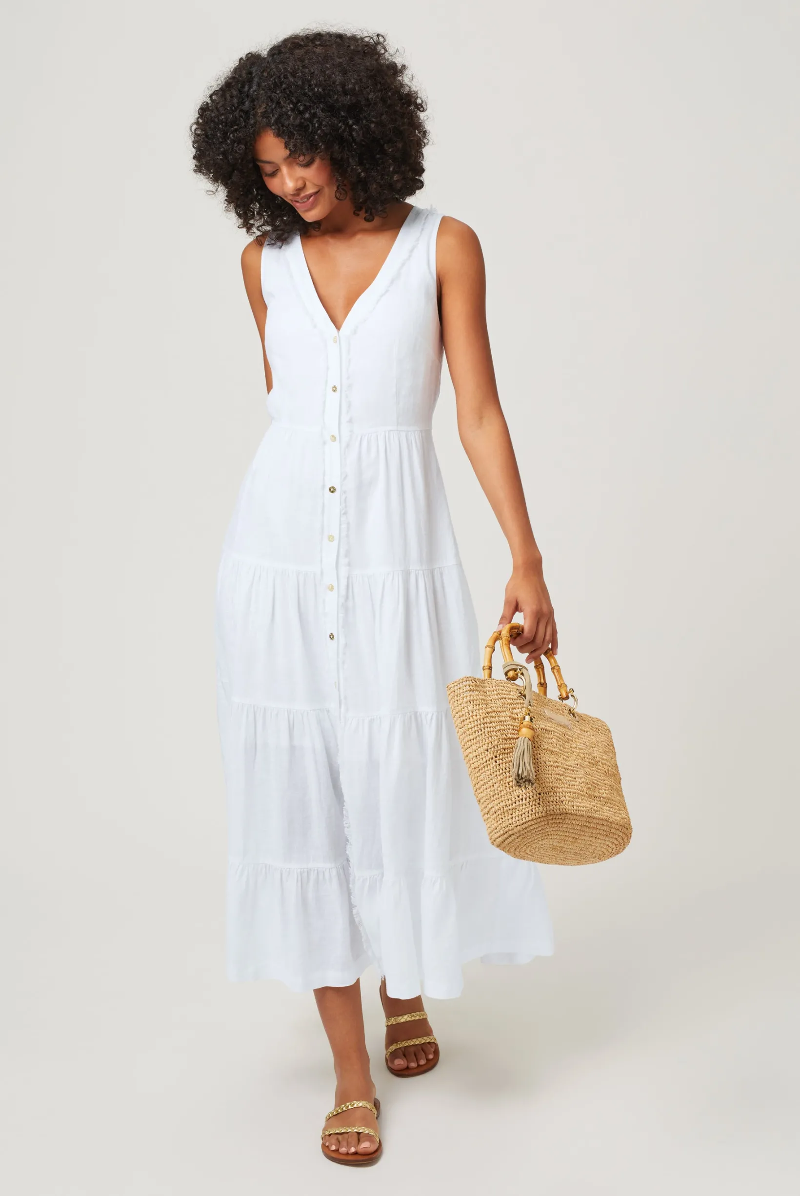 The linen White Bay Plunge Buttoned Maxi Dress has been designed with flexibility in mind. While the button-through placket offers a tailored look, the free-flowing, tiered skirt offers a more relaxed look for the summer. This is the perfect dress for a day in the city or an evening by the coast.